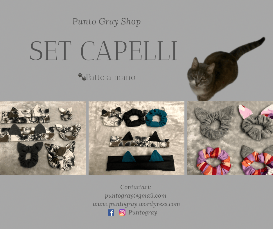 La caratteristica di questo set per capelli e’ la presenza delle orecchie da gatto. Sono fatti a mano e ci sono i tessuti disponibili a scelta.